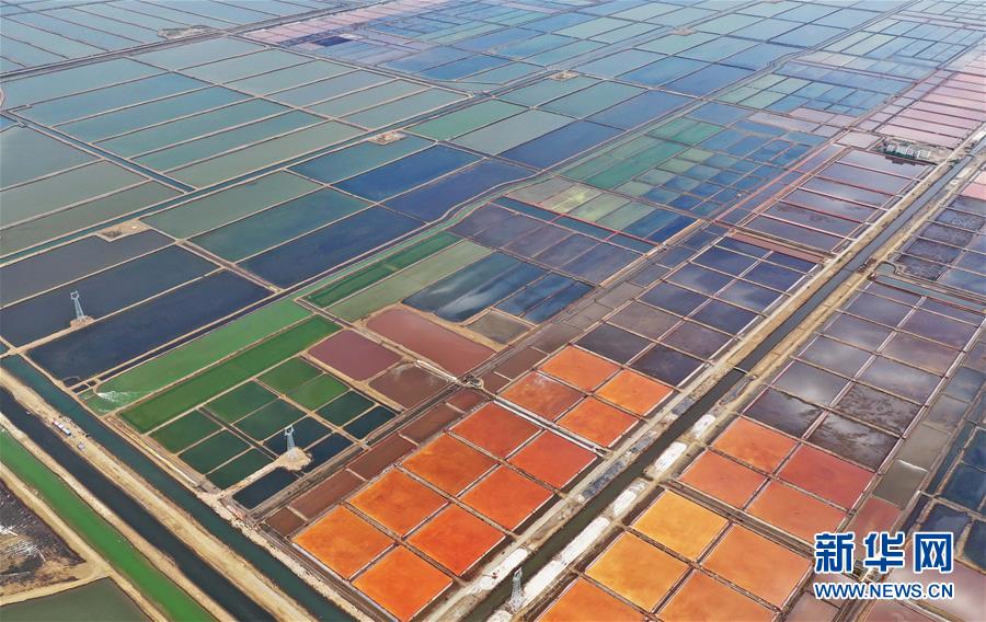 7月3日拍摄的大清河盐场(无人机拍摄)。从空中俯瞰河北省唐山市海港经济开发区大清河盐场,不同浓度的盐池呈现不同的色彩,犹如大地上的巨型调色板。新华社记者杨世尧摄