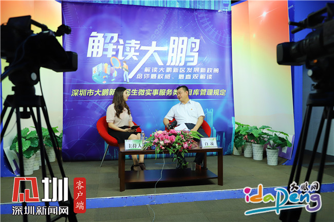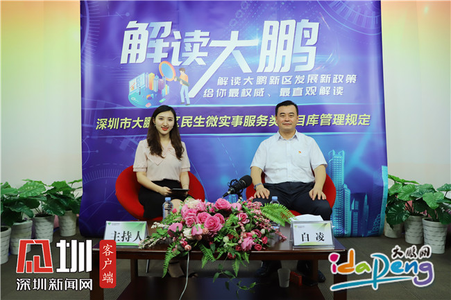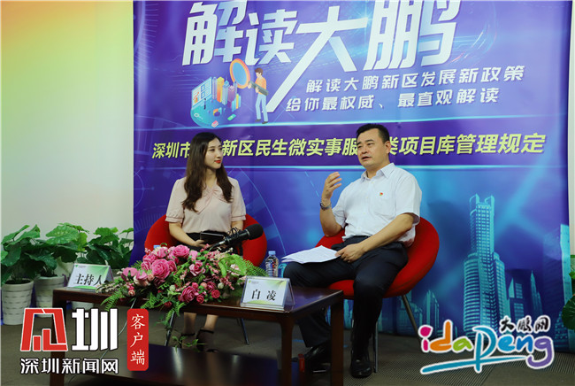 7月5日,大鹏新区统战和社会建设局常务副局长白凌走进深圳新闻网演播室,做客由大鹏新区综合办公室与深圳新闻网联合开展的“解读大鹏”系列访谈节目,为网友详细解读《深圳市大鹏新区民生微实事服务类项目库管理规定》(以下简称:《规定》)。