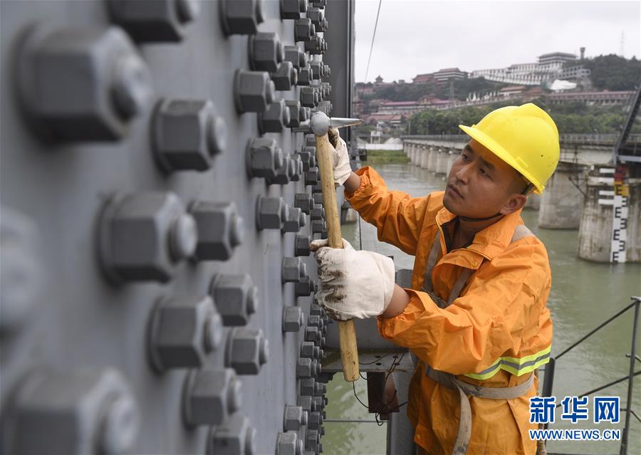7月11日,工作人员在检查涪江铁路大桥的钢梁。新华社记者刘坤 摄