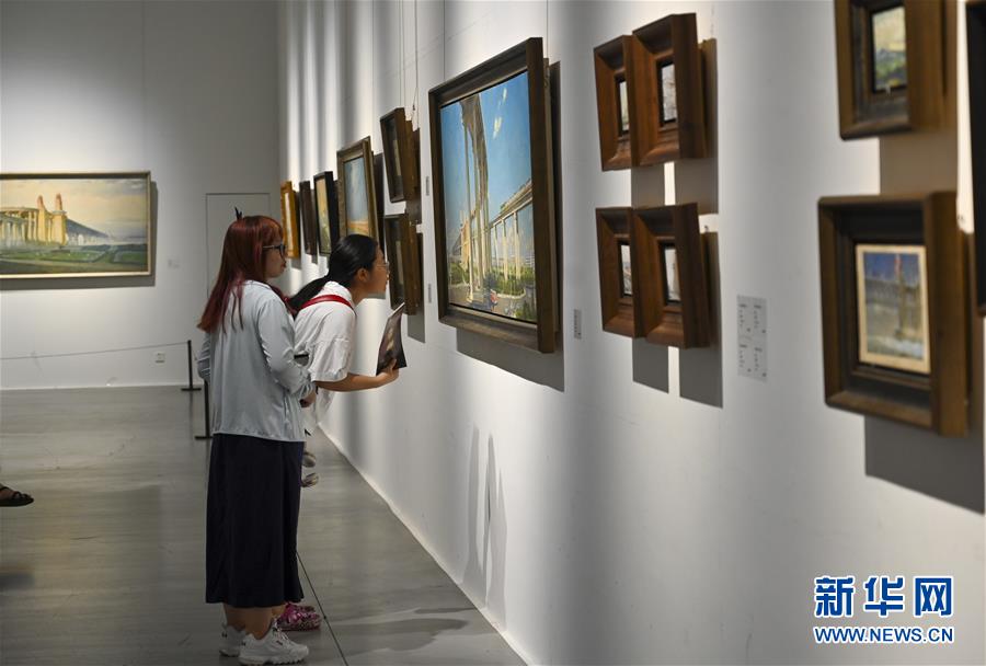 7月14日,在重庆美术馆里,参观者在“大桥记忆”主题展上欣赏艺术作品。新华社记者刘潺摄