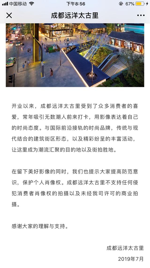 7月11日,成都远洋太古里官方公众号曾以“街拍提示”为题发文,提醒“在留下美好影像的同时,我们也提示大家提高防范意识,保护个人肖像权。成都远洋太古里不支持任何侵犯消费者肖像权的拍摄以及未经我司许可的商业拍摄。”