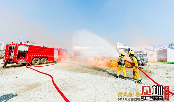 深圳新闻网7月18日讯(记者 吴炳然 通讯员 张磊)7月18日上午,光明区2019年突发事件综合应急救援演练在华夏路与东明大道交汇处空地举办,区领导刘德峰,区应急管理局、区突发事件应急委员会成员单位、各街道社区、参演企业等相关单位负责人约300余人参加活动。