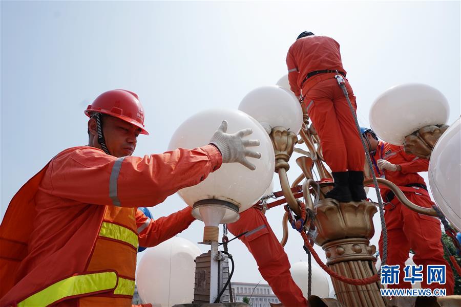 7月26日,在北京长安街上,国网北京电力城市照明管理中心华灯班工人在高温下检修华灯。 近日,全国部分地区持续高温天气,许多户外劳动者不畏酷暑,坚守岗位。 新华社记者 鞠焕宗 摄