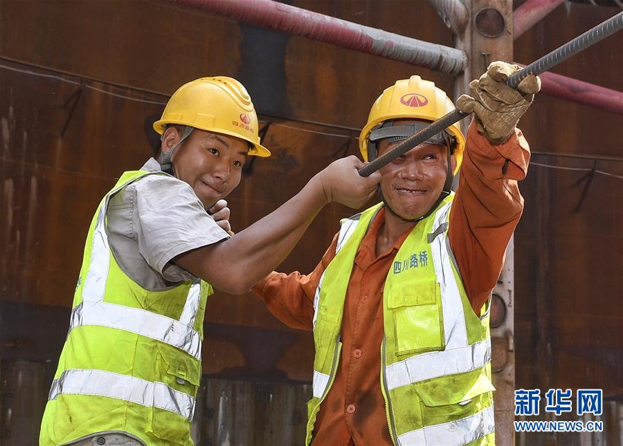 7月26日,在四川宜宾市临港经济开发区的临港长江大桥控制性工程——三号主墩施工现场,工程人员在安装水平主塔钢筋。 近日,全国部分地区持续高温天气,许多户外劳动者不畏酷暑,坚守岗位。 新华社记者 刘坤 摄