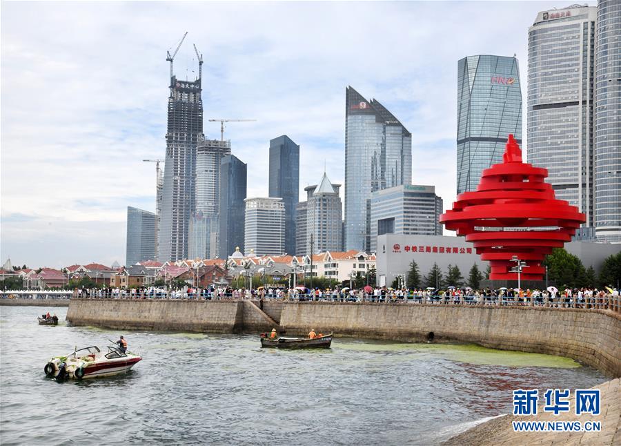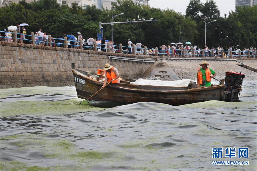 7月28日,保洁人员在青岛五四广场附近海域清理浒苔。进入旅游旺季,青岛市政环卫部门加强了海上保洁力量,每天对沿海漂浮的近岸垃圾进行不间断打捞,努力为游客创造一个洁净舒适的滨海旅游环境。新华社记者李紫恒摄