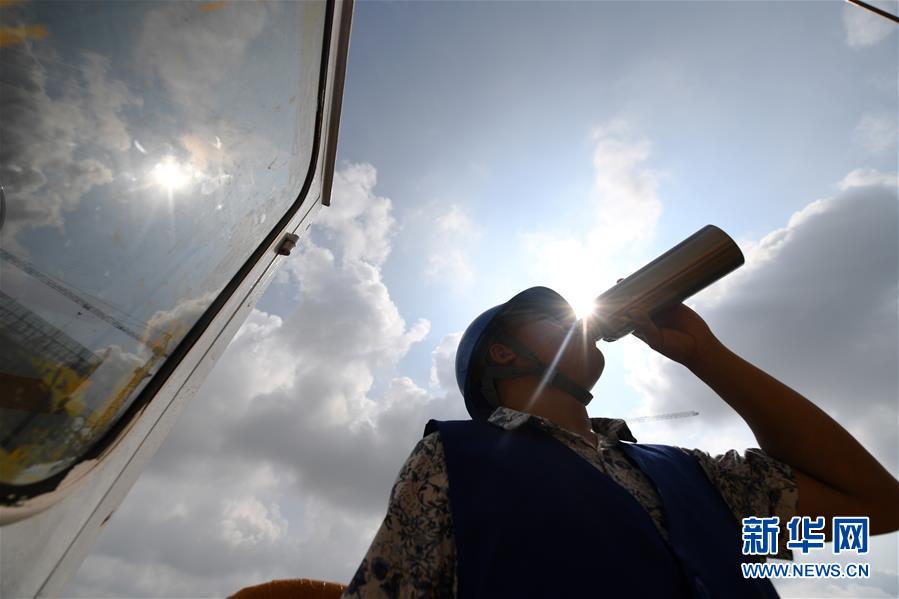 7月30日,在南宁市一处建筑工地的塔吊上,岑官书在作业间隙喝水。