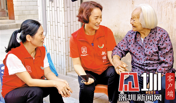 光明街道党员、团员、群众志愿者与老人聊家常。