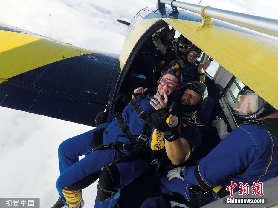 当地时间8月4日,英国Grange-over-Sands,为了给英国皇家全国救生艇协会(RNLI)筹款,94岁高龄的Adeline Franken勇敢地从15,000英尺(4,572米)高空跳下,完成了高空跳伞,也成了英国年纪最大的高空跳伞者记录保持者。图片来源:视觉中国