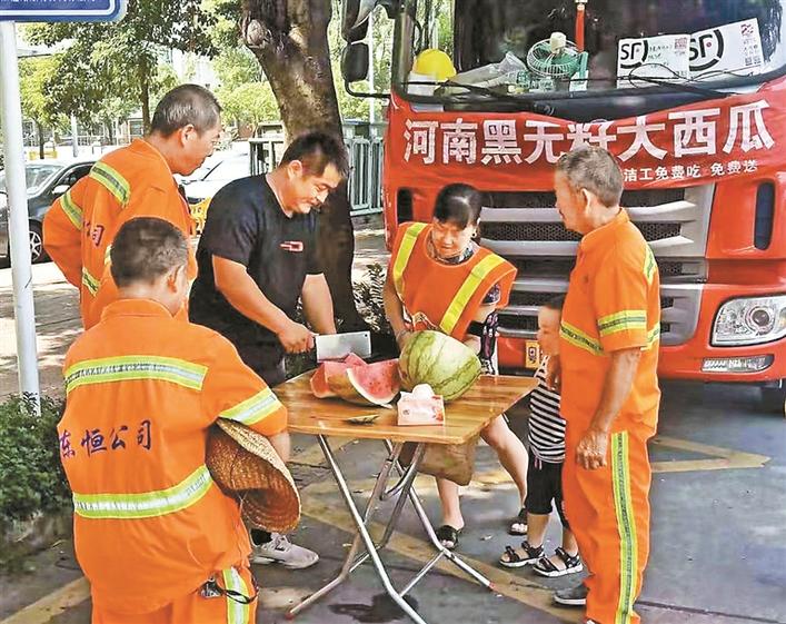 记者在现场看到,一辆挂着“爱心西瓜直通车”横幅的大货车上,满载着大西瓜,旁边还有一个免费品尝的位置,不时有市民过来品尝西瓜,而环卫工人则可以免费领走西瓜。