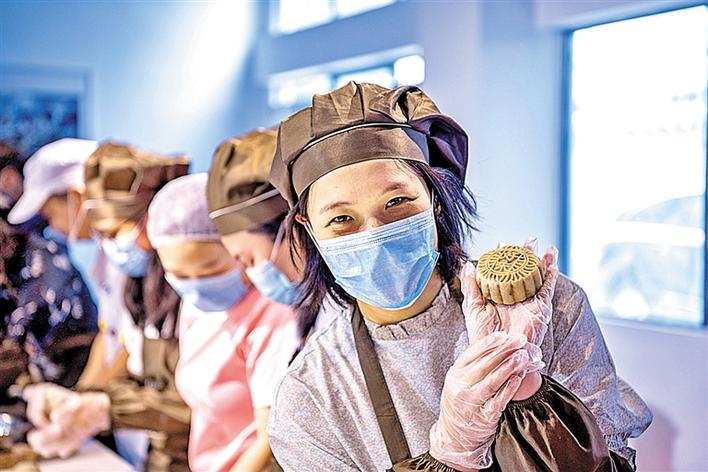 当天下午,青年们有序地排队取号、签到、领取衣物。穿戴好制作月饼的围裙、帽子、手袖、口罩等服饰后,个个具有大厨风范。制饼师傅现场示范月饼的制作过程,青年们跟着学习面皮和馅的包法、月饼模具使用等。在等待月饼烘烤期间,大家在文化使者的带领下参观游园、看深圳月团非遗片,了解深圳中秋文化。随着红豆、五仁、白莲蓉等成品月饼出炉,活动室充盈着让人垂涎三尺的饼香。
