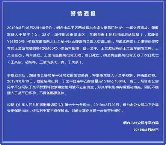 8月16日晚上10点多,山东烟台牟平区发生一起交通事故。据牟平警方通报证实,该事故致使被撞车辆内一家人中的母子死亡,肇事司机于某和被撞车辆司机王某受伤。38岁的于某平为公职人员,血液中乙醇含量为151mg/100ml(我国醉驾标准为车辆驾驶人员血液中的酒精含量大于或者等于80mg/100ml)。