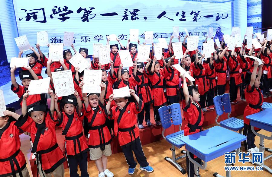 9月2日,小学一年级新生齐声朗读《少年中国说》。当日,上海音乐学院实验学校小学一年级举行“开笔礼”活动,一年级新生在老师的带领下,开启识字习礼的学习生涯。新华社记者陈飞摄