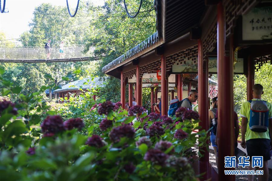 8月24日,在比利时布吕热莱特市,游客参观天堂动物园的“中国园”中的一处长廊。新华社记者郑焕松摄