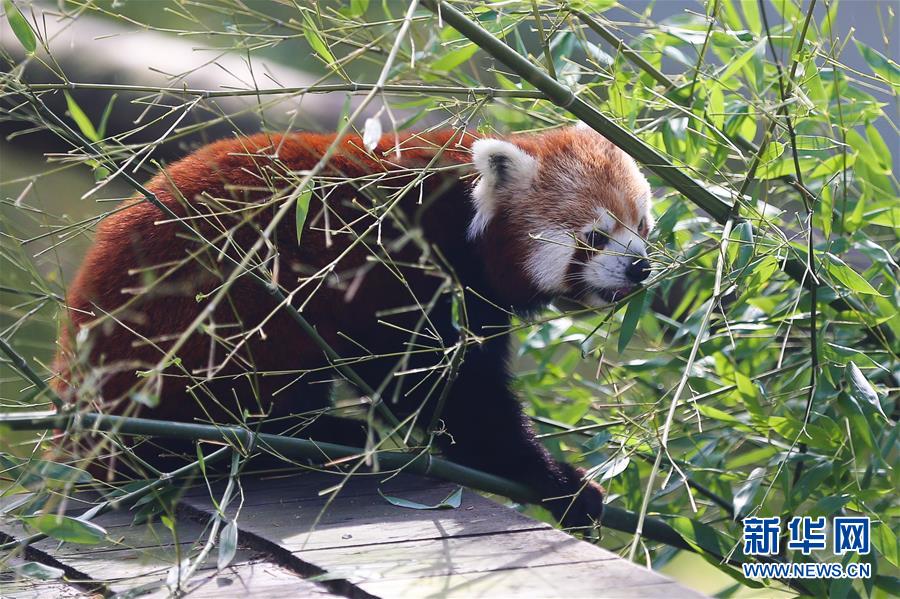 8月24日,在比利时布吕热莱特市,一只小熊猫在天堂动物园的“中国园”觅食。新华社记者郑焕松摄