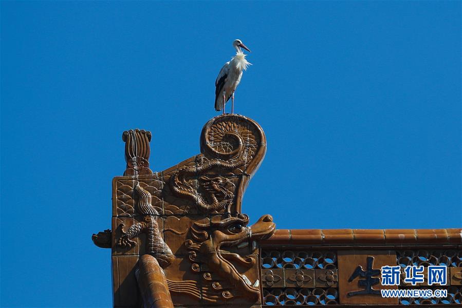 8月24日,在比利时布吕热莱特市,一只白鹳站在天堂动物园“中国园”的建筑上。新华社记者郑焕松摄