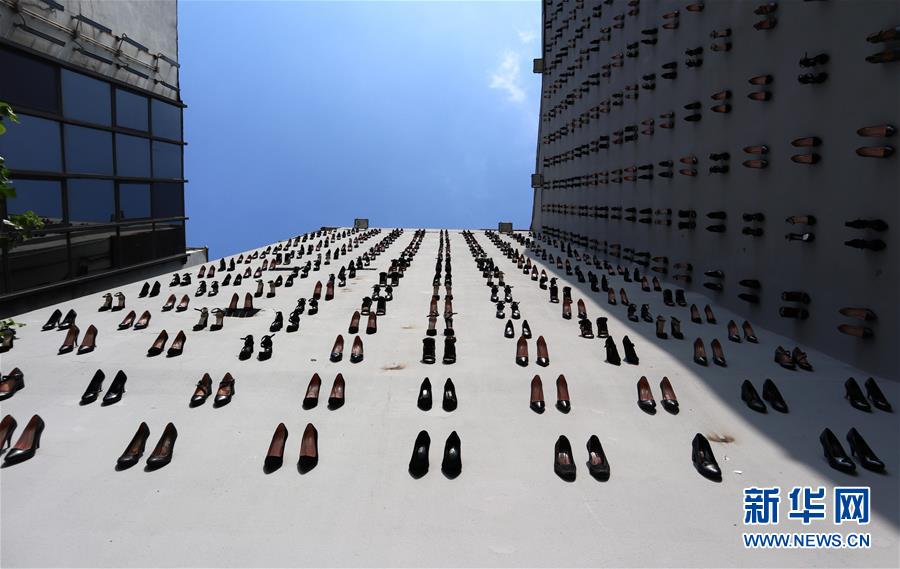 这是9月17日在土耳其伊斯坦布尔市中心拍摄的“高跟鞋墙”现代艺术作品。近日,一个由440双高跟鞋组成的“高跟鞋墙”现代艺术作品在土耳其伊斯坦布尔市中心与公众见面。该作品旨在呼吁对妇女权益的保护。新华社记者徐速绘摄