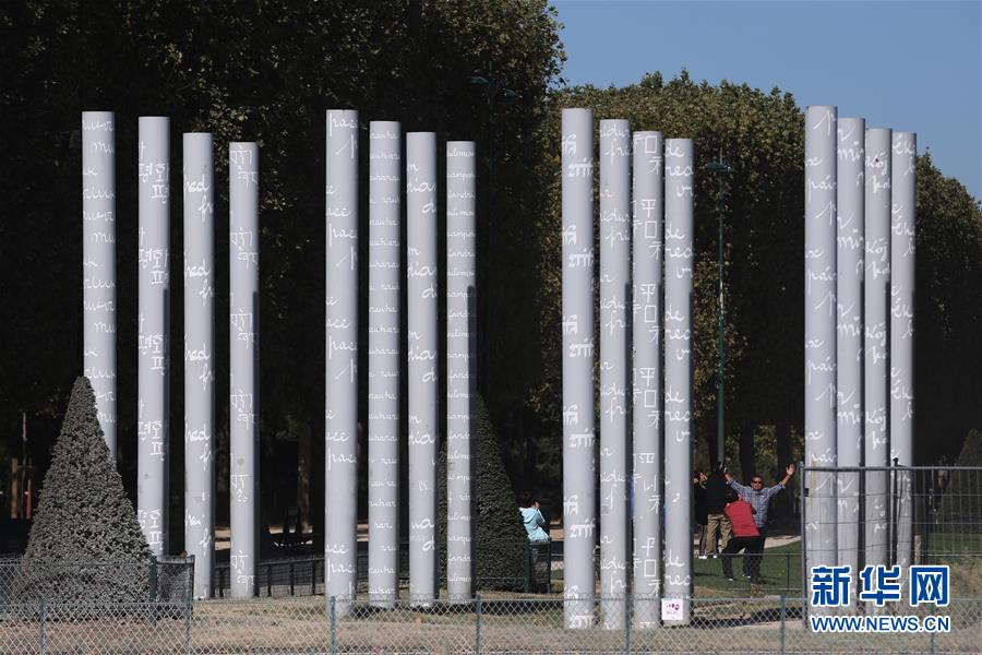 9月19日,在法国巴黎埃菲尔铁塔脚下的战神广场,人们走过和平墙的金属圆柱,柱子上用多种语言写着“和平”。在法国巴黎埃菲尔铁塔脚下的战神广场,矗立着一座由玻璃、金属等材料制成的和平墙。和平墙长16.4米、宽13.8米、高9米,墙面用包括中文在内的32种语言写满“和平”字样,周围布置的32根圆柱也刻满“和平”字样。新华社记者高静摄