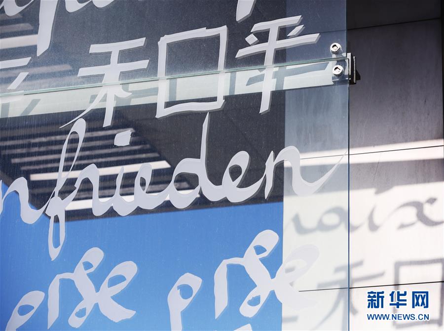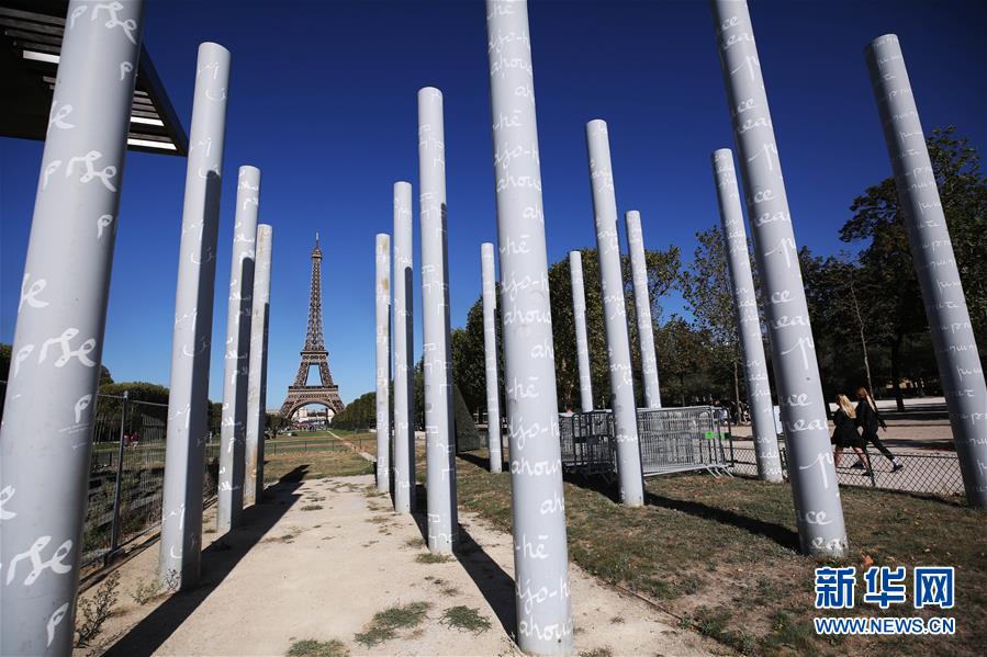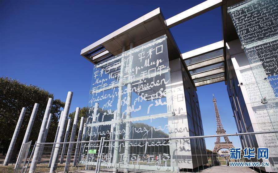 这是9月19日在法国巴黎埃菲尔铁塔脚下的战神广场拍摄的和平墙。在法国巴黎埃菲尔铁塔脚下的战神广场,矗立着一座由玻璃、金属等材料制成的和平墙。和平墙长16.4米、宽13.8米、高9米,墙面用包括中文在内的32种语言写满“和平”字样,周围布置的32根圆柱也刻满“和平”字样。新华社记者高静摄