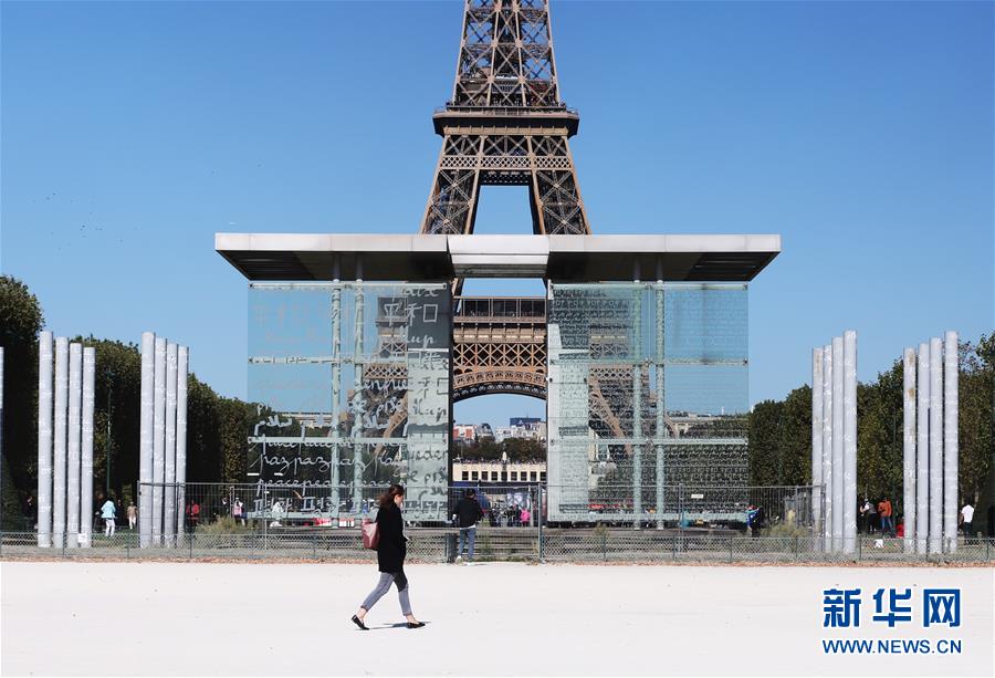 9月19日,在法国巴黎埃菲尔铁塔脚下的战神广场,一名女子走过和平墙。在法国巴黎埃菲尔铁塔脚下的战神广场,矗立着一座由玻璃、金属等材料制成的和平墙。和平墙长16.4米、宽13.8米、高9米,墙面用包括中文在内的32种语言写满“和平”字样,周围布置的32根圆柱也刻满“和平”字样。新华社记者高静摄