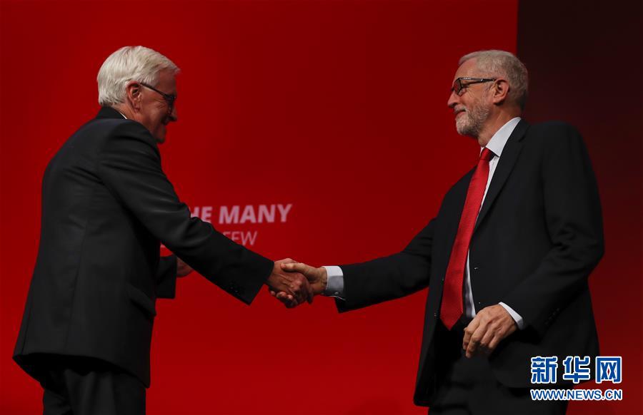 9月23日,在英国布莱顿,英国工党影子内阁财政大臣约翰·麦克唐奈(左)与工党领袖科尔宾在工党年度大会上握手。当日,2019年英国工党年度大会在英国布莱顿继续进行。新华社记者韩岩摄