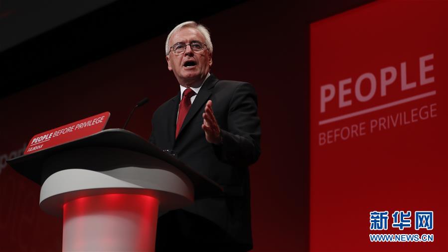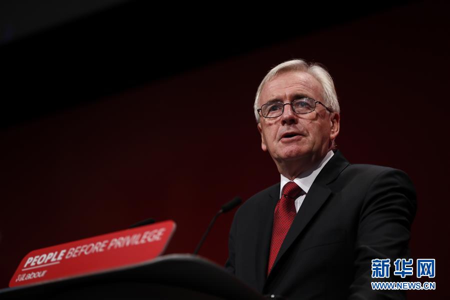 9月23日,在英国布莱顿,工党影子内阁财政大臣约翰·麦克唐奈在工党年度大会上演讲。当日,2019年英国工党年度大会在英国布莱顿继续进行。新华社记者韩岩摄