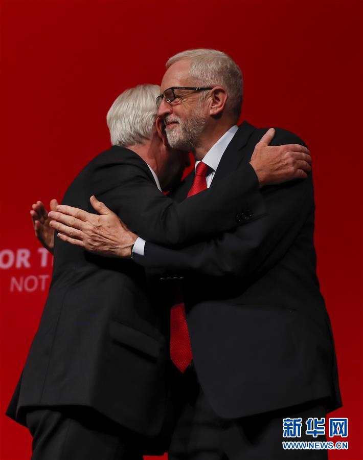 9月23日,在英国布莱顿,英国工党影子内阁财政大臣约翰·麦克唐奈(左)与工党领袖科尔宾在工党年度大会上拥抱。当日,2019年英国工党年度大会在英国布莱顿继续进行。新华社记者韩岩摄