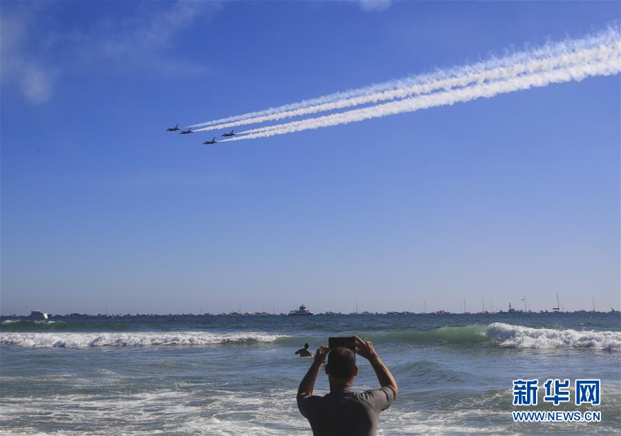 10月6日,在美国加利福尼亚州亨廷顿海滩,一名男子拍摄特技飞行表演。一年一度的亨廷顿海滩特技飞行表演于10月4日至6日举行。新华社记者李颖摄