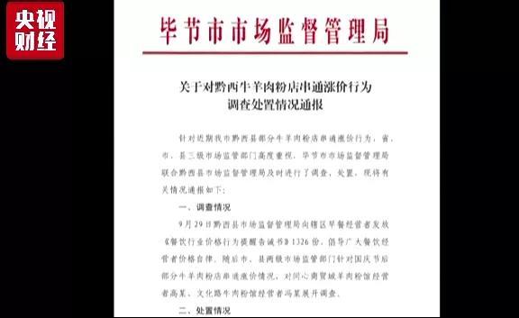 10月11日,毕节市市场监督管理局发布通报,粉馆经营者高某、冯某在微信群内发表涨价言论串通涨价的行为属实,但鉴于当事人积极配合调查并公开道歉,对高某、冯某两人作出行政告诫的处罚。同时,市场监管部门对当地牛羊肉粉馆进行了排查。目前,所有经营户未发现涨价行为或已主动恢复了原价。