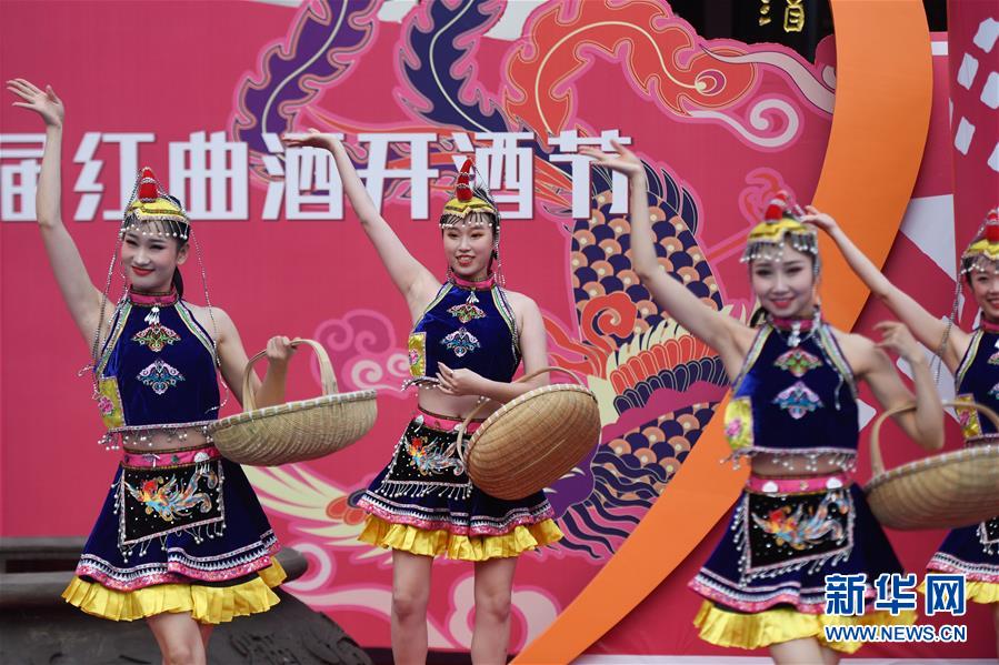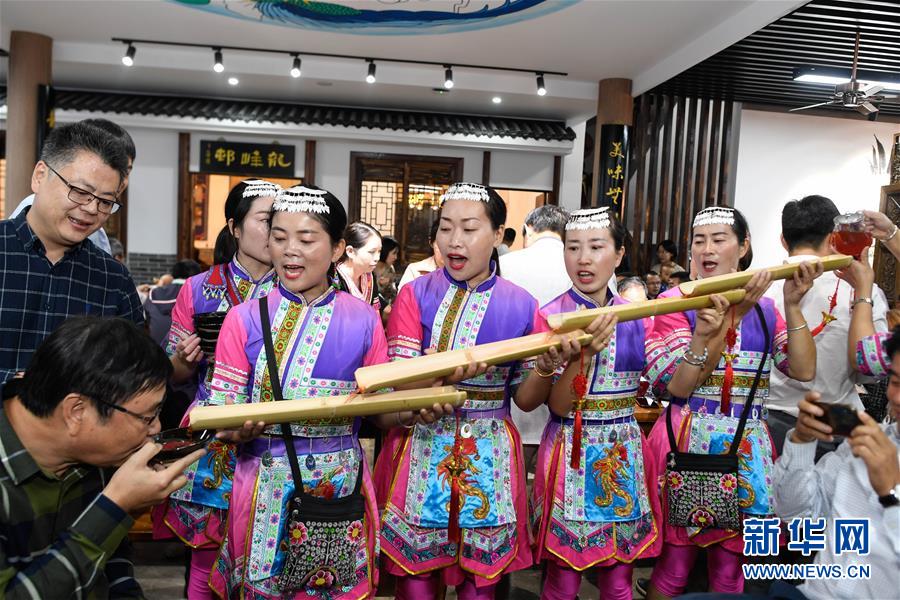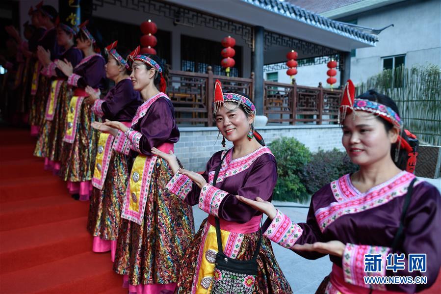 10月16日,在龙峰民族村,身穿畲族特色服装的演员在开酒节上表演。当日,浙江省桐庐县莪山畲族乡在龙峰民族村举办第三届红曲酒开酒节,九十余桌宴席沿道路排开,四方宾客和当地村民一起品尝具有畲族特色的“十大碗”长桌宴。新华社记者黄宗治摄
