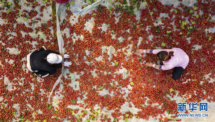 10月20日,武邑县武罗农产品种植专业合作社的农民在分拣山楂(无人机拍摄)。近年来,河北省衡水市武邑县在脱贫攻坚中积极引导农民集中连片发展无公害山楂种植,取得了良好的经济效益。目前,该县已发展山楂种植3000余亩,带动10余个村600余户种植户致富增收。新华社记者李晓果摄