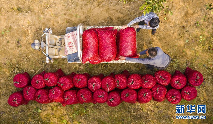 10月20日,武邑县武罗农产品种植专业合作社的农民将收获的山楂装车(无人机拍摄)。近年来,河北省衡水市武邑县在脱贫攻坚中积极引导农民集中连片发展无公害山楂种植,取得了良好的经济效益。目前,该县已发展山楂种植3000余亩,带动10余个村600余户种植户致富增收。新华社记者李晓果摄