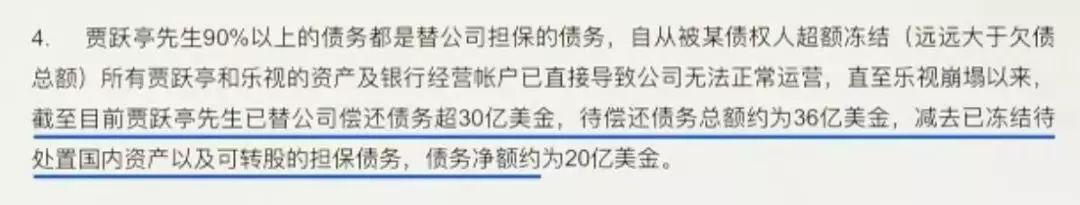10月14日,贾跃亭债务处理小组发表《声明》,称“贾跃亭先生90%以上的债务都是替公司担保的债务”“截至目前,贾跃亭先生已替公司偿还债务超30亿美金,待偿还债务总额约为36亿美金,减去已冻结待处置国内资产以及可转股的担保债务,债务净额约为20亿美金。”