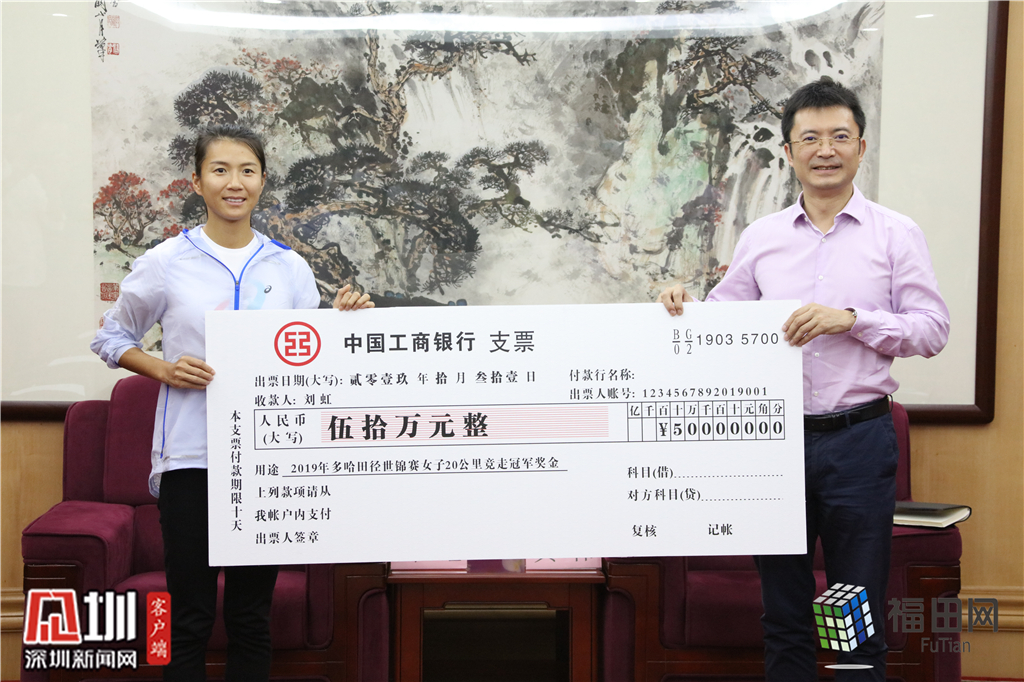 黄伟代表区委区政府给刘虹颁发了50万元奖励金,以表彰她顽强拼搏的精神和对福田体育事业做出的贡献。