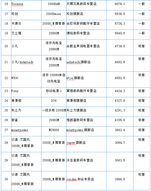 天猫平台热销的30款电池容量标称20000mAh的充电宝。