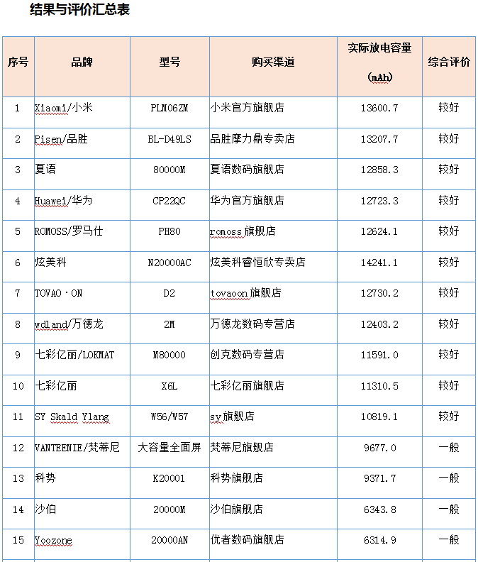 结果显示,有11款表现较好,8款表现一般,11款表现较差。对比产品上标注的额定容量,5款充电宝容量严重虚标。30款天猫热销充电宝中,超过六成移动电源样品没有标注额定容量。