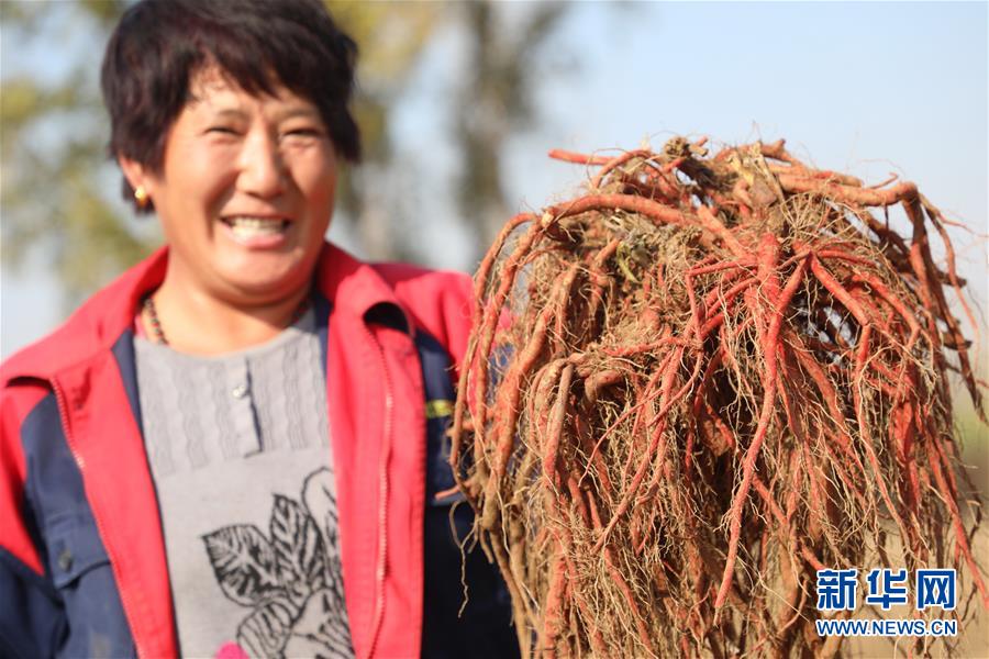 11月10日,河北省唐山市丰润区任各庄镇任各庄村农民在展示收获的丹参。初冬时节,河北省唐山市丰润区任各庄镇种植的丹参进入收获期,种植户忙着采收、晾晒,田野、村庄里一派忙碌景象。近年来,河北省唐山市丰润区充分利用自然资源优势,依托公司订单引导农民种植丹参、射干和铁皮石斛等中药材,取得良好收益。新华社记者牟宇摄