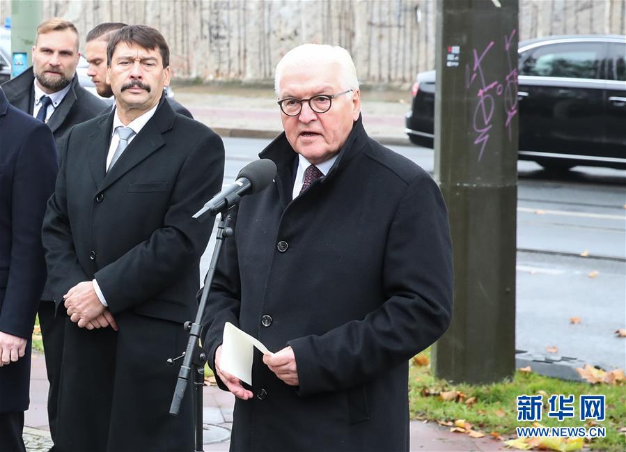 11月9日,在德国首都柏林,德国总统施泰因迈尔(右一)在柏林墙倒塌30周年纪念活动中致辞。新华社记者单宇琦摄