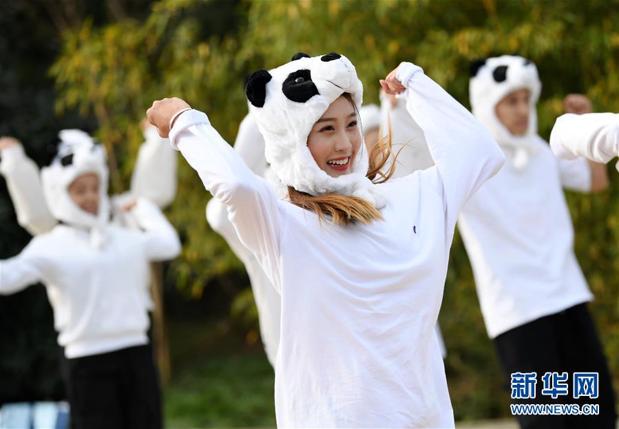11月11日,装扮成熊猫形象的的舞蹈演员在新生秦岭大熊猫亮相活动上表演。新华社记者李一博摄