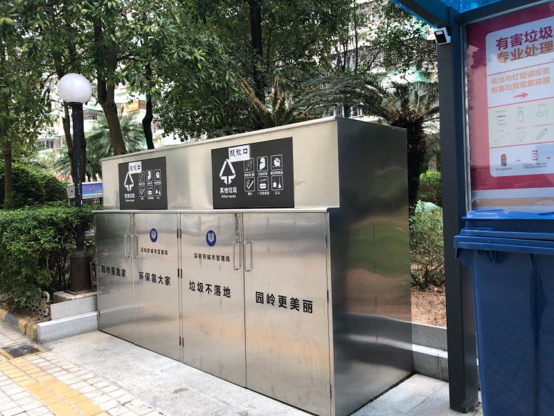 除了动的早,在垃圾分类工作上,园岭街道还想的远。经过前期的探索与学习,街道选取长城社区试点推广垃圾分类,并在其他垃圾桶外安装不锈钢桶罩,从2019年3月份开始选址,到中期的同业委会、社区、设计公司的沟通,再到后期的专人监督建设过程,街道城管科争取每一个细节都进行人性化的处理,使得5处试点取得了良好了效果,并最终在长城社区整体铺开,投放了35套。