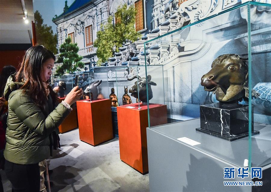 11月13日,观众在“回归之路——新中国成立70周年流失文物回归成果展”上参观圆明园马首铜像(右)。新华社记者李贺摄