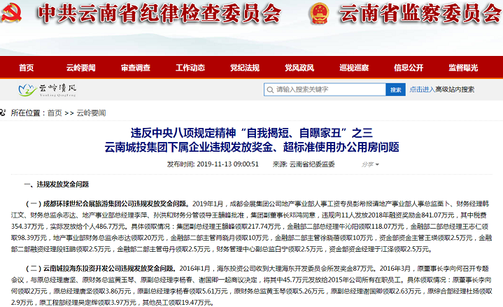 武汉晚报2019年11月13日讯 继曝光领导干部违规乘坐飞机头等舱、动车一等座,购买茶酒等问题后,11月13日,云南城投集团再曝家丑,揭发下属企业违规发放奖金、超标准使用办公用房问题。