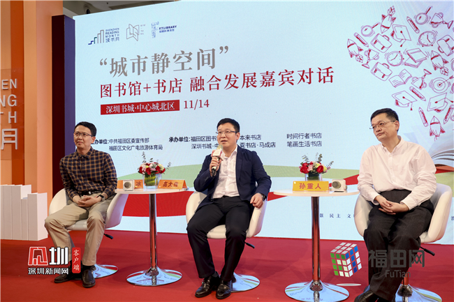 深圳新闻网11月15日讯(见圳客户端、深圳新闻网记者 邓涛)11月14日,由中共福田区委宣传部、福田区文化广电旅游体育局主办的“福田区‘图书馆+书店’战略合作联盟发布仪式暨‘城市静空间’授牌+‘图书馆+书店’融合发展嘉宾对话活动”在中心书城北区大台阶举行。福田区领导、福田区文化广电旅游体育局领导、图书馆界、出版发行界和学术界的专家及代表、文化名人、知名学者等各界嘉宾领导共同参与,见证“图书馆+书店战略联盟”的成立。