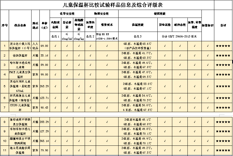 经测评结果显示,18款样品中有17款样品全部符合本次比较试验所设定的化学安全性指标、物理安全性指标、使用性能及标签标识要求,其中评出五星级儿童保温杯有11款。
