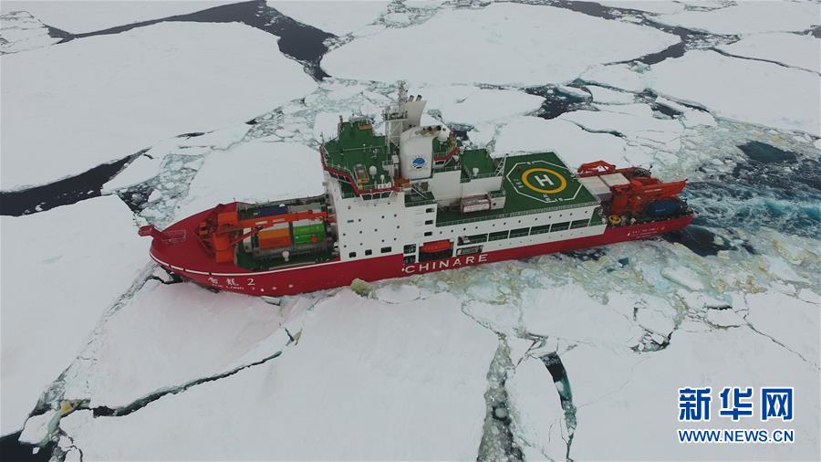 11月19日,“雪龙2”号航行在普里兹湾浮冰区(无人机拍摄)。