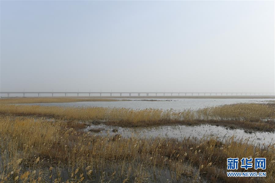 11月17日在新疆若羌县拍摄的台特玛湖特大桥。为防止路基阻挡风沙形成堆积而阻断水流,破坏生态,穿越湖区的铁路采用了桥梁建筑结构。格库铁路连接青海省格尔木市与新疆维吾尔自治区库尔勒市,其中,新疆段途经多个自然保护区,珍稀野生动物资源丰富,但高寒、干旱亦导致生态脆弱,一旦破坏难以恢复。为此,铁路多处采用以桥代路的建设方式,以桥梁建筑结构替代传统地面铁路铺装,虽然造价更高,但是大大降低了对当地生态环境的影响。新华社记者 宋彦桦 摄