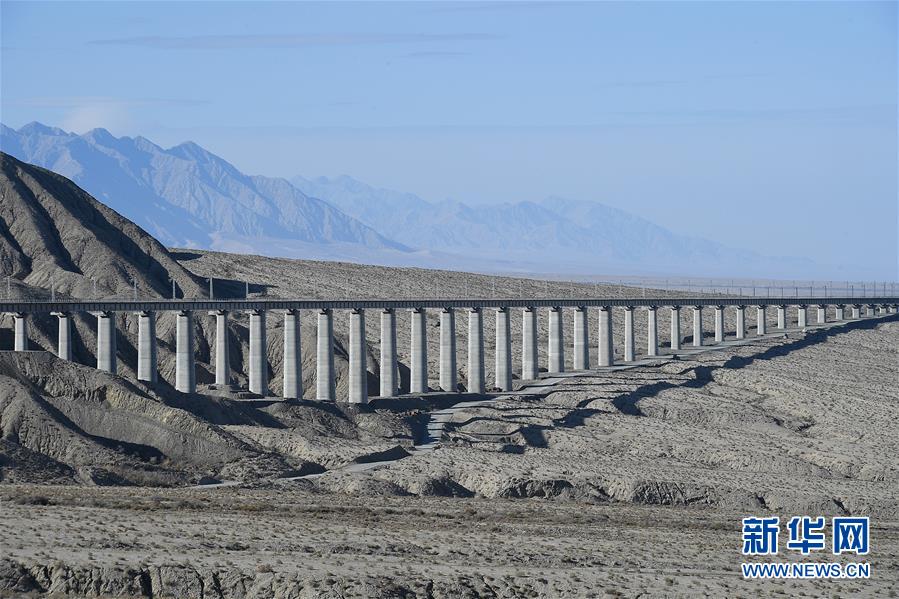 11月18日在新疆若羌县拍摄的哈勒塔萨依4号特大桥。工程设计为以桥代路,既不会阻断水源,同时为当地的野骆驼、黄羊等野生动物保留了通道。格库铁路连接青海省格尔木市与新疆维吾尔自治区库尔勒市,其中,新疆段途经多个自然保护区,珍稀野生动物资源丰富,但高寒、干旱亦导致生态脆弱,一旦破坏难以恢复。为此,铁路多处采用以桥代路的建设方式,以桥梁建筑结构替代传统地面铁路铺装,虽然造价更高,但是大大降低了对当地生态环境的影响。新华社记者 宋彦桦 摄
