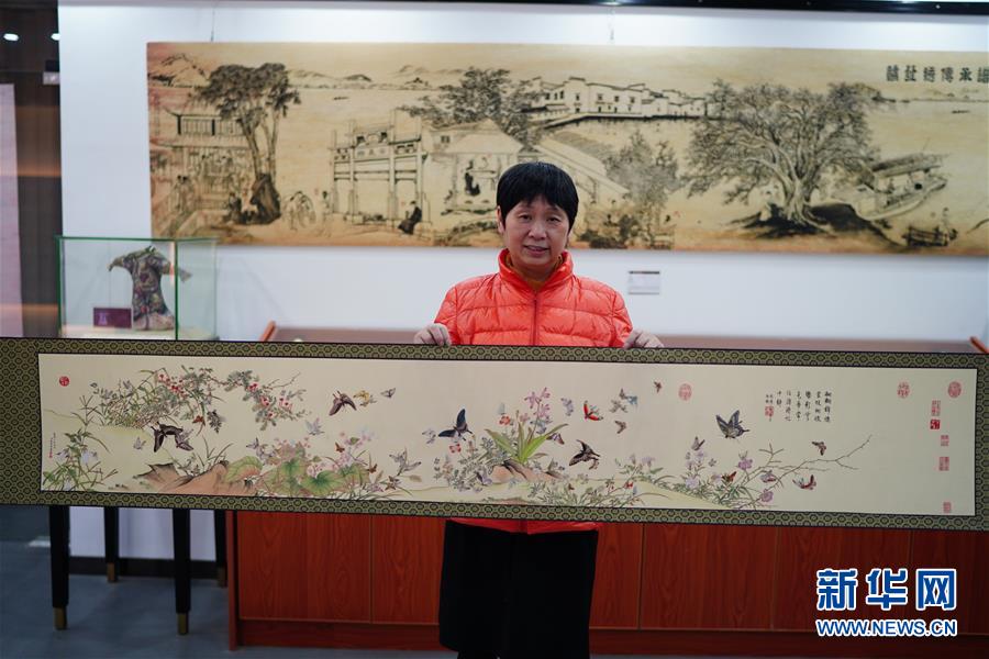 11月21日,陶永红展示赣发绣作品《百蝶图》。这幅作品使用了百余种颜色,每种颜色的头发都要进行八小时漂染,创作耗时两年。新华社记者周密摄