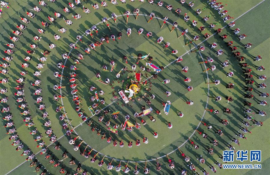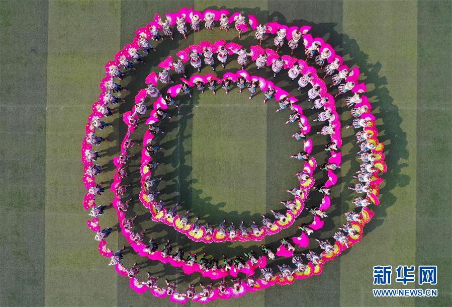 11月23日,当地群众在芦笙斗马节开幕式上表演民族歌舞(无人机拍摄)。当日,广西融水苗族自治县第十九届芦笙斗马节开幕。本届芦笙斗马节的内容包括少数民族非遗文化展演、芦笙舞比赛、扶贫产品展、美食节大赛、水上表演等民族特色活动。新华社记者黄孝邦摄
