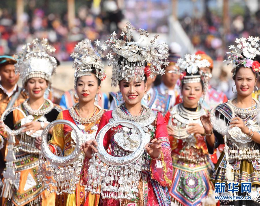 11月23日,当地群众在芦笙斗马节开幕式上展示苗族银饰。当日,广西融水苗族自治县第十九届芦笙斗马节开幕。本届芦笙斗马节的内容包括少数民族非遗文化展演、芦笙舞比赛、扶贫产品展、美食节大赛、水上表演等民族特色活动。新华社记者黄孝邦摄