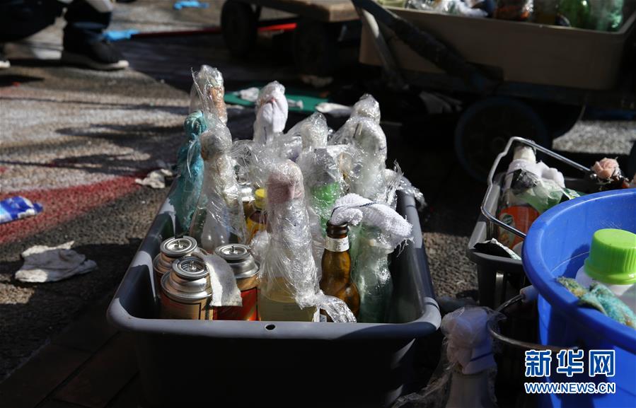 这是丢弃在香港理工大学校园内的汽油弹等危险品(11月21日摄)。新华社记者李震摄